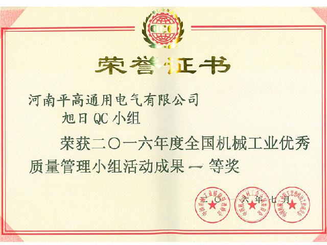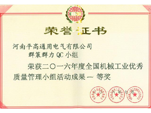 2016年度全国机械工业优秀质量管理小组活动成果一等奖